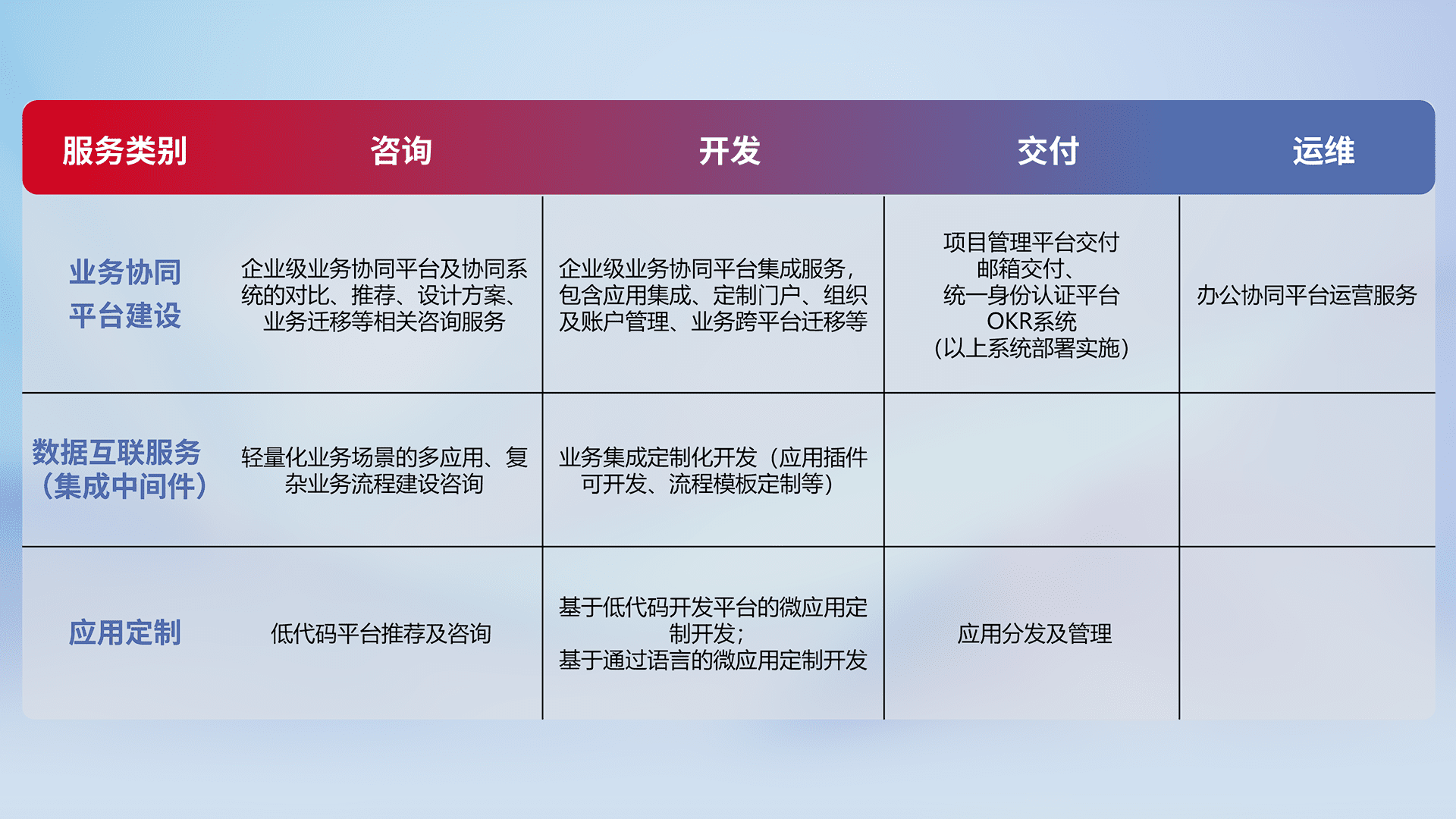 针对钉钉、、、企微、、、、IDaas等平台级产品提供产品的规划、、、方案、、、、交付、、、、定制化开发等服务,,,,实现如统一协同办公、、智能客户服务、、、混合会议管理、、、智能数据查询、、、等业务场景,,实现数字化转型。。