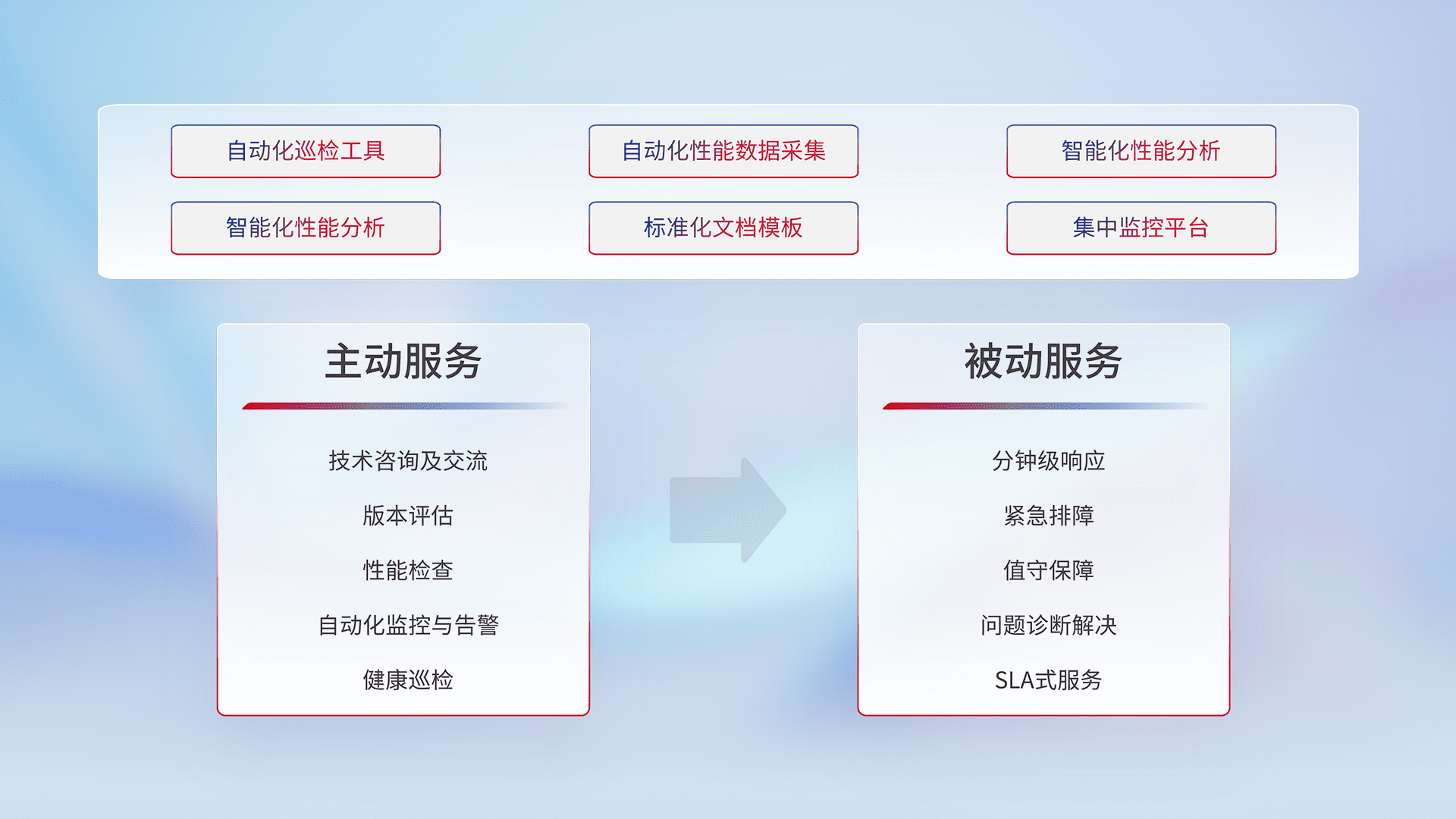 智能化工具和标准化文档,,保障服务质量,,,提供主动服务(包含技术咨询、、、、版本评估、、性能检查、、、自动化监控与告警、、健康巡检)和被动服务包含(分钟级响应、、、、紧急排障、、、、值守保障、、、、问题诊断解决、、SLA服务)。。